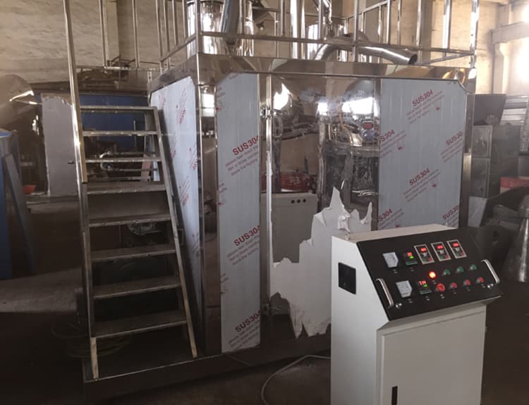 本產品由貯料預冷倉,螺旋推進器,低溫粉碎機,低溫鼓風機,旋風分離器,粉塵過濾器,電控柜組成。物料進入預冷倉,經液氮低溫冷凍至脆化點以下,然后螺旋推進低溫粉碎機腔內。在高速運轉的活動刀片和固定齒圈的相互作用下,物料在機腔內撞擊摩擦從而達到粉碎的效果。粉碎細度可通過調節(jié)活動刀片與風機的轉速來控制物料的細度。活動刀盤轉速越快,細度越細,風機轉速越快,物料越粗。粉碎好的粉料在旋風分離器旋轉離心力和引風機的作用下自動流向出口。粉塵進入脈沖除塵箱,經過過濾后回收再利用。冷氣大部分返回料倉循環(huán)使用。
